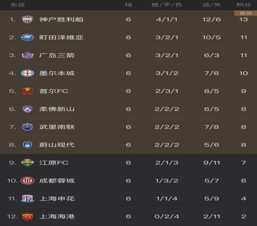 亚冠6轮战罢,中超3队依然包揽积分榜最后3位。其中亚冠新军蓉城积6分,是战绩最好的中超队。而申花和海港分别积4分和2分,排名倒数第2和倒数第1位。