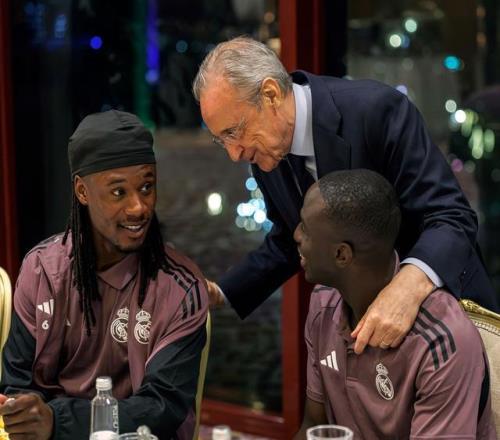 皇马官方晒照,俱乐部主席弗洛伦蒂诺已抵达吉达,在球队下榻酒店与球员和教练组打招呼。